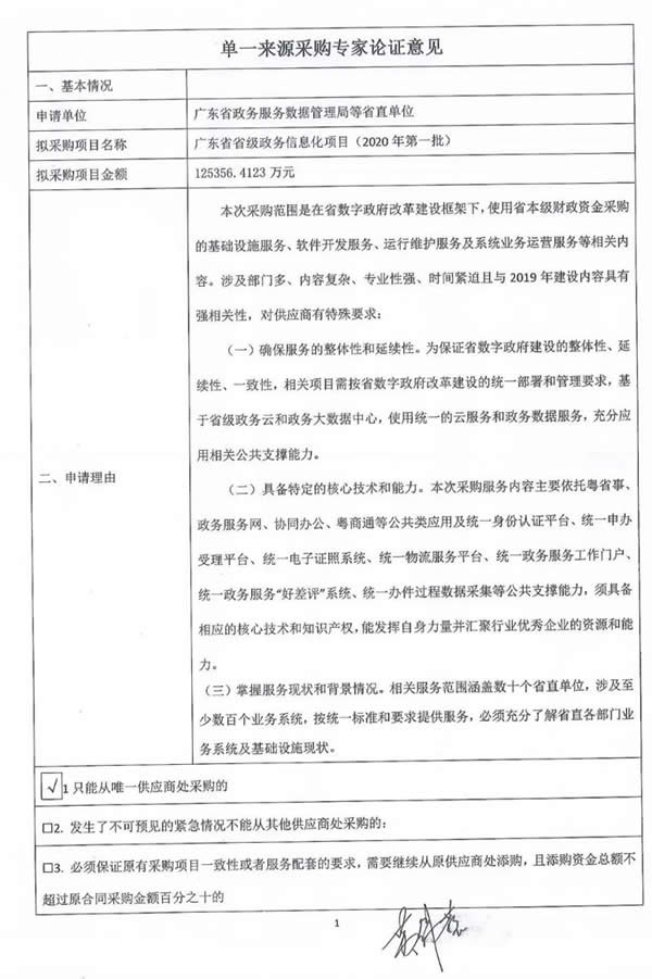 就本次采購(gòu)而言,同時(shí)符合上述特殊要求的供應(yīng)商只有數(shù)字廣東網(wǎng)絡(luò)建設(shè)有限公司(以下簡(jiǎn)稱“數(shù)字廣東公司”)。因此,本次采購(gòu)具備“只能從供應(yīng)商處采購(gòu)”的條件,按照《政府采購(gòu)法》第三十一條的規(guī)定,可以采用單一來(lái)源向數(shù)字廣東公司采購(gòu)相關(guān)服務(wù)。