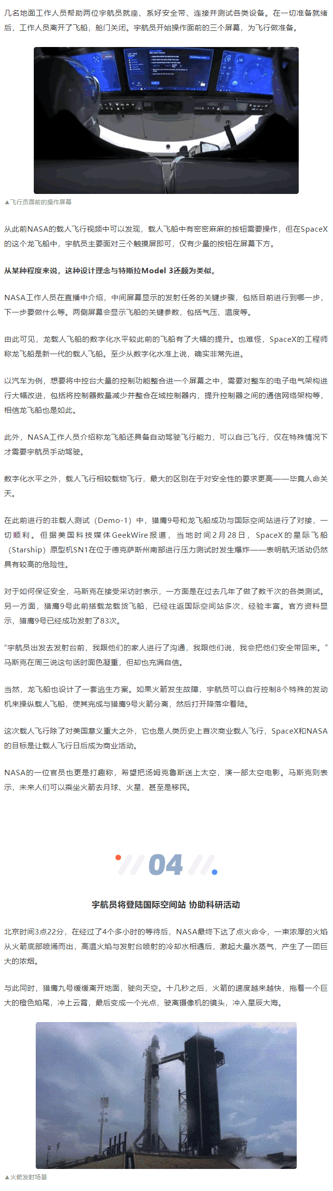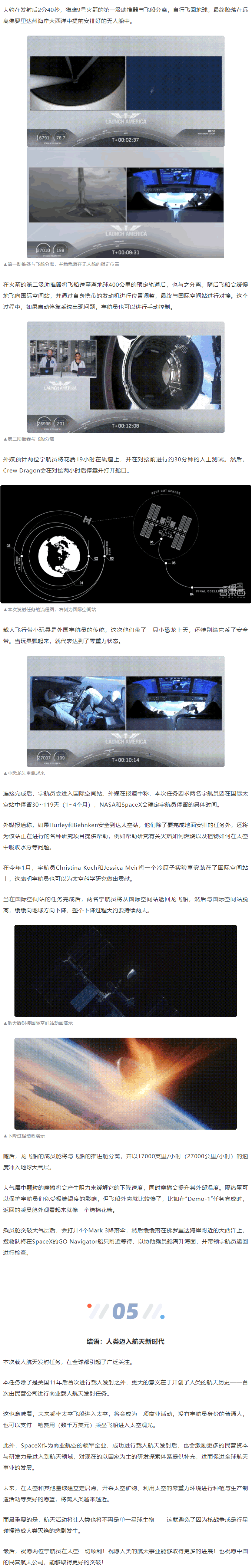 這次載人航天任務(wù),被稱為獵鷹9號火箭龍載人飛船二次測試任務(wù)(Falcon 9’s launch of Crew Dragon’s second demonstration ,Demo-2),宇航員進(jìn)入太空后,會搭乘龍飛船前往國際空間站,完成相關(guān)的任務(wù)后,兩位宇航員則將繼續(xù)乘坐龍飛船返回地球。