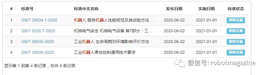 6月2日,國家市場監(jiān)督管理總局和國家標準化管理委員會發(fā)布了4項與機器人相關的新增國家推薦標準,這4項標準均從2021年1月1日開始實施。