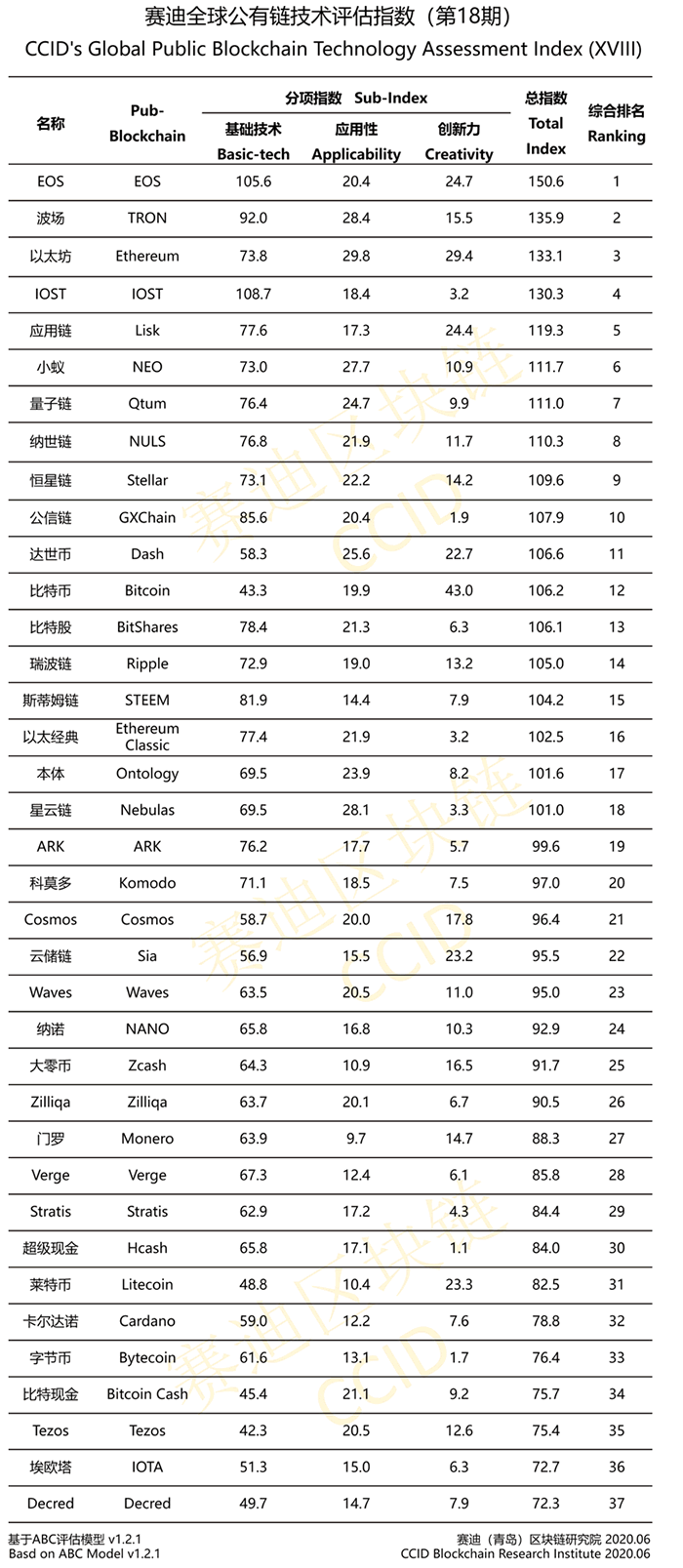 2020年6月18日,中國電子信息產(chǎn)業(yè)發(fā)展研究院(賽迪研究院)發(fā)布第18期賽迪公有鏈技術(shù)評(píng)估指數(shù),對(duì)37條知名公有鏈從技術(shù)維度進(jìn)行綜合考量并給出排名。