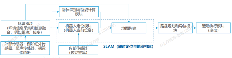 環(huán)境感知模塊的基礎硬件是各類不同的傳感器,他們充當了機器人的五官,收集不同的測量信息;SLAM算法(Simultaneous Localization