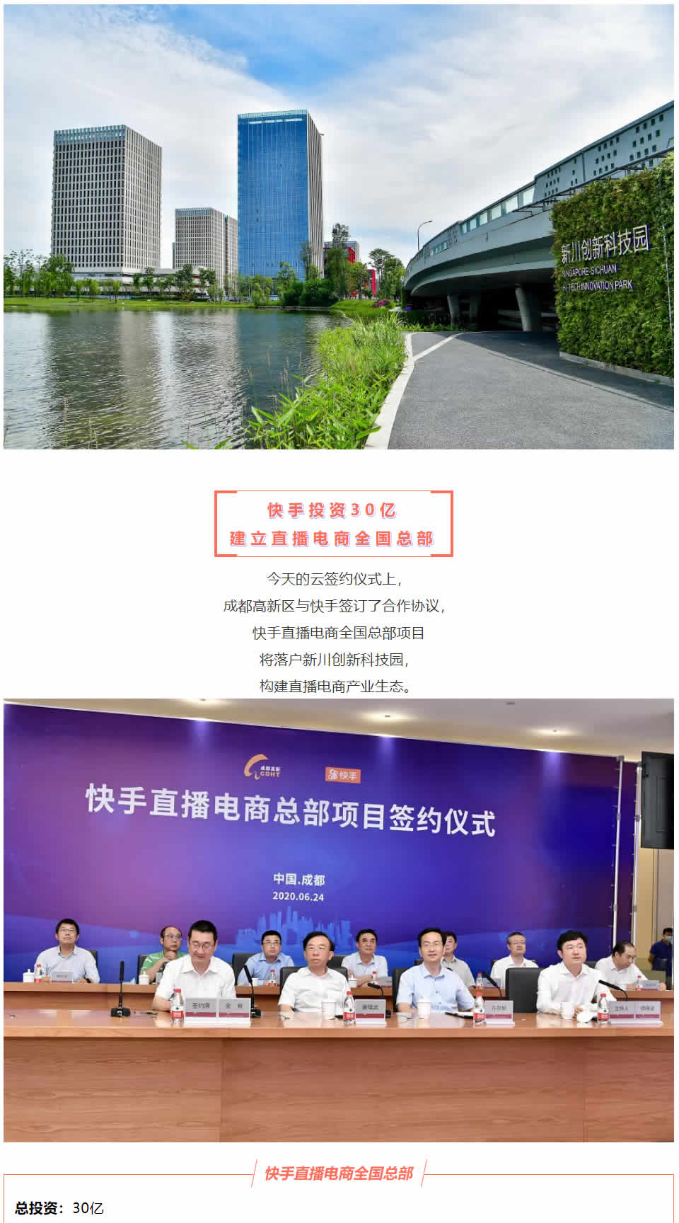 成都G新區(qū)分別與頭部短視頻平臺快手、中國互聯(lián)網(wǎng)BAT三巨頭之一的百度簽約,宣布快手直播電商全國總部項(xiàng)目和百度智能駕駛項(xiàng)目落戶新川創(chuàng)新科技園。