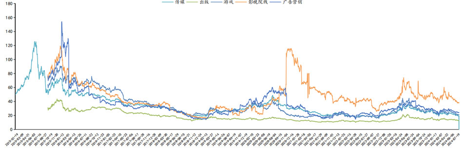 2024年1月2日至7月19日,傳媒(申萬)板塊下跌-23.86%,同期滬深300指數(shù)漲幅4.51%,傳媒(申萬)板塊跑輸大盤28.37%。細分行業(yè)中,出版/ 游戲/廣告營銷/影視院線板塊漲跌幅分別為-13.44%、-27.76%、-23.34%、-22.82%。受宏觀經(jīng)濟波動帶來的投資不確定性與技術進步導致的行業(yè) 間競爭加劇影響,傳媒行業(yè)2024年上半年行情表現(xiàn)有所回落。