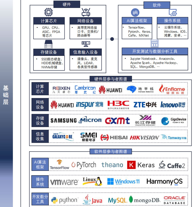 人工智能基礎(chǔ)層涵蓋計(jì)算芯片、網(wǎng)絡(luò)設(shè)備、存儲設(shè)備和信息采集設(shè) 備,以及操作系統(tǒng)、開發(fā)測試分析工具和AI算法框架,共同構(gòu)成了 人工智能產(chǎn)業(yè)發(fā)展的基石底座