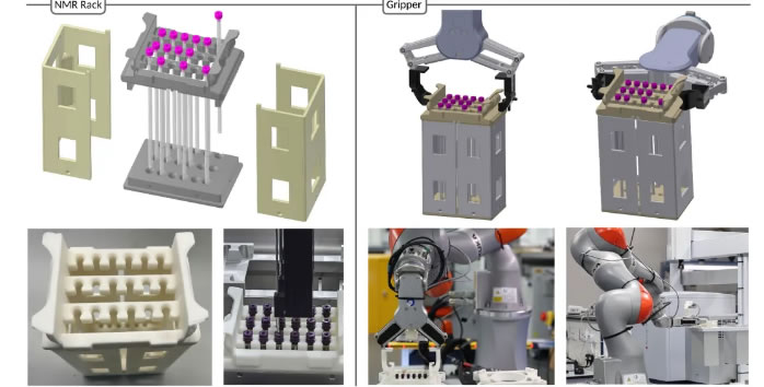 用于移動 agent 處理的定制核磁共振機架。左圖:組裝好的機架預(yù)先裝有核磁共振管,并放置在 ISynth 平臺內(nèi),然后液體輸送工具將液體分配到管子中,管子有帶孔的蓋子,以便分配。右圖:NMR-Agent 使用定制的指尖,使其能夠垂直和水平地抓握和移動機架。垂直握把方向用于從 ISynth 甲板上取下機架,水平握把方向用于將機架移入臺式核磁共振自動采樣器。