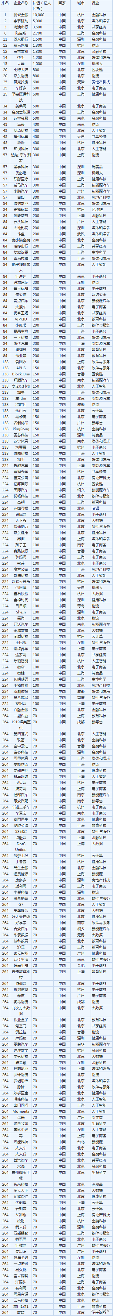 螞蟻金服以10000億元估值中國獨角獸企業(yè)排名榜首,字節(jié)跳動估值5000億排在D二,滴滴出行、陸金所以及微眾銀行排在前五位,估值超過千億的還有菜鳥網(wǎng)絡(luò)、京東數(shù)科、快手和大疆