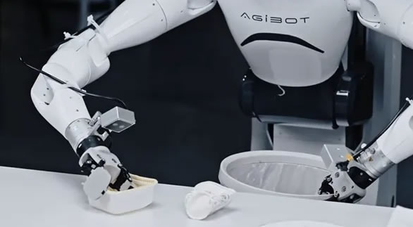 2)視覺+觸覺下,靈巧手準確執(zhí)行酒杯和酒瓶的抓握,雙臂+雙手協(xié)同完成倒酒操作。 同樣在家用場景中,智元機器人可實現(xiàn)一手將日用品放入被另一只手提著的手提袋內(nèi), 協(xié)同效應(yīng)較好;同時,揀取桌面不同位置的垃圾并置于垃圾桶中。