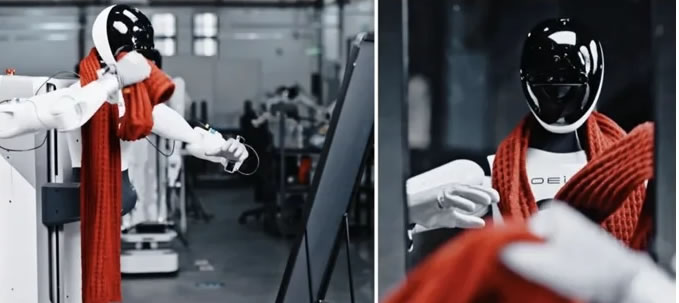 1)機器人保持動作柔順性與位姿穩(wěn)定性,雙手靈巧配合,可以完成具有生物運動特征的圍巾佩戴任務(wù),先模型通過觀察鏡子中圍巾和頭的相對位置,完成圍巾的初始佩戴, 然后根據(jù)兩側(cè)的長度比例,左手準確的握住需要調(diào)整的一端,將其拉到適當?shù)奈恢,? 后右手接過左手遞過來的圍巾執(zhí)行“圍”的螺旋纏繞動作。
