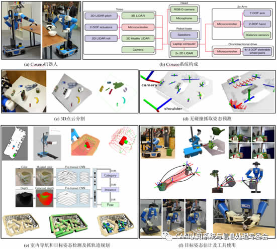 Cosero[1]是德國波恩大學(xué)的Sven Behnke團(tuán)隊根據(jù)家庭環(huán)境中的日常操作任務(wù)而研制的一款仿人操作機(jī)器人(如圖1(a)(b))。機(jī)器人底部配備了四輪獨立轉(zhuǎn)向行走機(jī)構(gòu),以便在靈活的通過狹窄通道,上部配備了兩個7自由度機(jī)械臂已完成擬人的操作,并在夾持器末端裝有紅外測距傳感器已達(dá)到對抓取目標(biāo)的距離探測,在D端安裝有Kinect相機(jī),以實現(xiàn)對目標(biāo)環(huán)境的3D感知。Cosero通過底盤的激光雷達(dá)進(jìn)行導(dǎo)航和定位,采用法線估計和場景分割相結(jié)合的方法對目標(biāo)進(jìn)行3D點云分割,采用無碰撞抓取方法[1]對目標(biāo)物體進(jìn)行抓取(如圖1(c)(d))。在論文[2]中,作者運用Cosero進(jìn)行零件分揀搬運實驗,通過2D激光雷達(dá)導(dǎo)航到作業(yè)點,通過RGB-D相機(jī)對目標(biāo)進(jìn)行識別分割,規(guī)劃抓取路徑和抓取姿態(tài)估計(如圖1(e))。在論文[3]中,作者采用深度學(xué)習(xí)方法對目標(biāo)進(jìn)行姿態(tài)估計,并完成了提壺灌溉,人機(jī)交互和使用工具等復(fù)雜任務(wù)(如圖1(f))。Schwarz[4]介紹了Cosero基于深度學(xué)習(xí)方法的目標(biāo)姿態(tài)估計和RGB-D SLAM等感知測量。