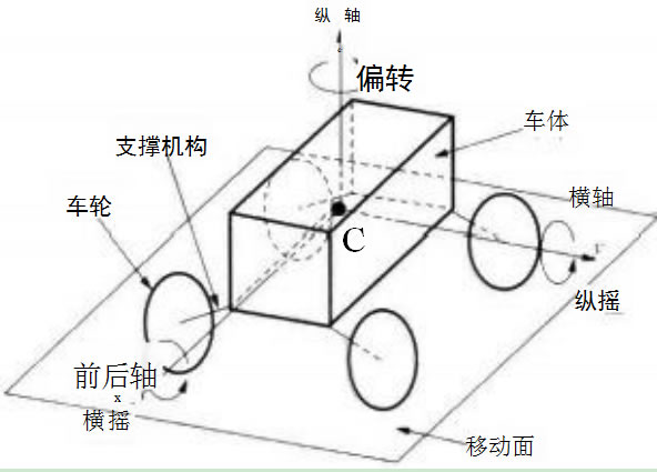 (1)車體:車體是車輪支撐機構(gòu)的安裝基座,在機械上起著決定各個車輪位置 關系的作用。另外,它在移動面與各車輪、車輪支撐部分之間起到驅(qū)動力和制動力 等的力傳遞作用。在實施移動時,多數(shù)情況下需要將車體上的某特定位置定義為基準點,車體有時也充當安裝搭載機械手等的基座。