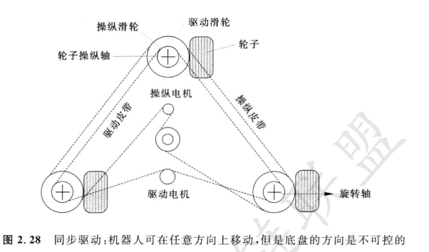在室內(nèi)移動(dòng)機(jī)器人應(yīng)用中,同步驅(qū)動(dòng)結(jié)構(gòu)(圖2.28)是一種流行的輪子裝配,也是 一個(gè)令人很感興趣的結(jié)構(gòu)。因?yàn)樗m然有3個(gè)驅(qū)動(dòng)和操縱輪,可是總共只用了2個(gè)電機(jī)。一個(gè)平移電機(jī)設(shè)置3個(gè)輪子一起的速度; 一個(gè)操縱電機(jī),使所有輪子繞著它們 各自的垂直操縱軸一起旋轉(zhuǎn)。但要注意的是,輪子是相對(duì)于機(jī)器人的底盤受操縱的, 所以,沒(méi)有直接方法重新設(shè)定機(jī)器人底盤的方向。實(shí)際上,由于凹凸不平輪胎的滑動(dòng),在整個(gè)時(shí)間里底盤方向一定會(huì)漂移,造成旋轉(zhuǎn)的航位測(cè)定誤差。