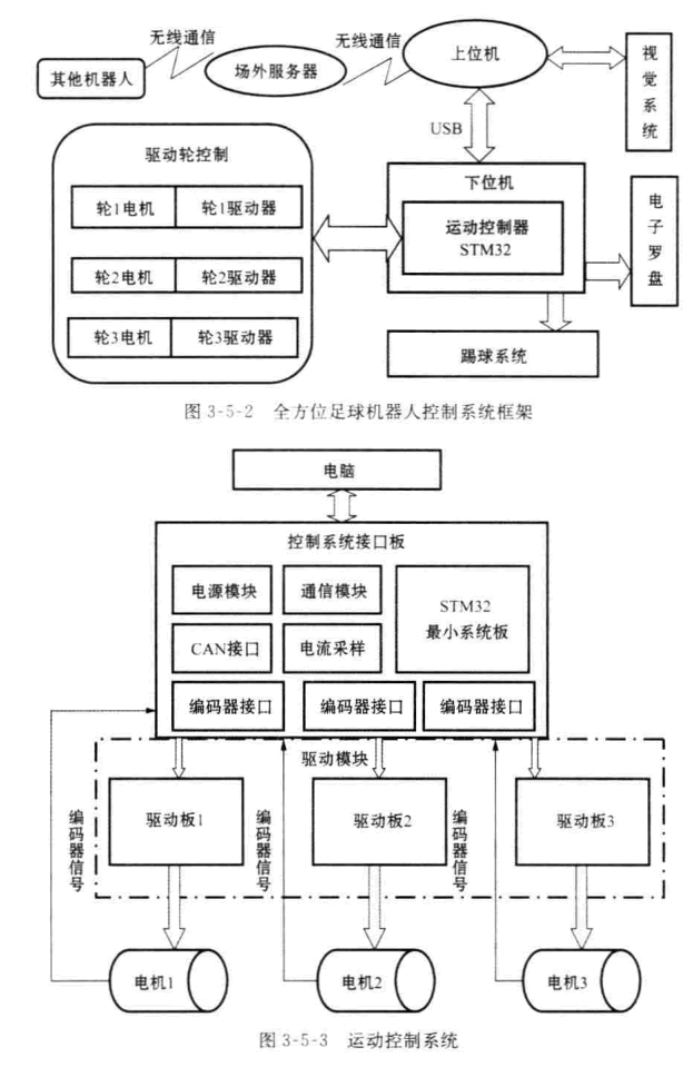 運動控制系統(tǒng)由通信模塊、電源模塊、控制模塊和電機驅(qū)動模塊組成。一塊主 控制板(STM32) 控制3塊驅(qū)動電路,分別驅(qū)動3個全方位輪,實現(xiàn)3軸聯(lián)動。當機器人工作時,通信模塊負責從PC 機接收指令數(shù)據(jù),包括3個輪子的速度和是否踢 球判斷以及踢球力度?刂颇K將3個輪子的速度發(fā)送到運動控制模塊,并產(chǎn)生 一個踢球信號控制氣動踢球系統(tǒng)產(chǎn)生踢球動作。運動控制模塊則控制著3個輪子 的速度,并且將通過閉環(huán)采集到的電機碼盤信息獲得的3個輪子的速度反饋回PC 機,供機器人上層策略算法使用。其結(jié)構(gòu)圖如圖3-5-3。通信模塊和運動控制模塊的CPU采用的是 STM32F103CB。