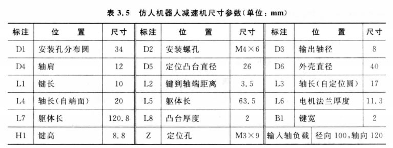 (2)直流伺服電機(jī)選型。根據(jù)上面的分析,為本節(jié)設(shè)計(jì)的智能交互機(jī)器人選用了兩種 類(lèi)型的直流伺服電機(jī),分別是上海瑞克科技發(fā)展有限公司的50SYXB-01 和 5 0SYXB- 02,質(zhì)量大約為0.5~1.0kg, 規(guī)格如表3.3所示。從表中不難看出這種直流伺服電機(jī) 轉(zhuǎn)速非常高,Z高可達(dá)到3000r/min(轉(zhuǎn)/分鐘);而其轉(zhuǎn)矩又很小,不能直接用于關(guān)節(jié)驅(qū) 動(dòng)裝置。