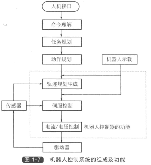 對(duì)于一個(gè)具有高度智能的機(jī)器人,它的控制系統(tǒng)實(shí)際上包含了“任務(wù)規(guī)劃” “動(dòng)作規(guī)劃”“軌跡規(guī)劃”和基于模型的 “伺服控制”等多個(gè)層次,如圖1-7所示。 機(jī)器人先要通過人機(jī)接口獲取操作者的 指令,指令的形式可以是人的自然語言, 或者是由人發(fā)出的專用的指令語言,也可 以是通過示教工具輸入的示教指令,或者 鍵盤輸入的機(jī)器人指令語言以及計(jì)算機(jī)程