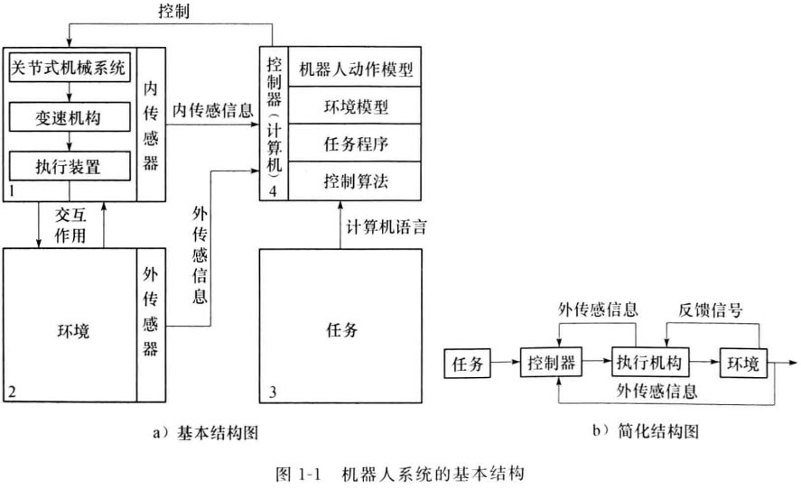 一 般情況下, 一 個機器人系統(tǒng)由下列四個互相作用的部分組成:機械手、環(huán)境、任務 和控制器,如圖1 - 1a 所示,圖1 - 16為其簡化形式。