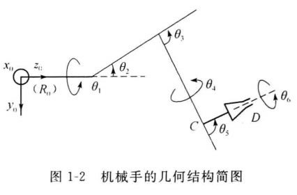 機械手是具有傳動執(zhí)行裝置的機械,它由臂、關節(jié)和末端執(zhí)行裝置(工具等)構成,組合為一個互相連接和互相依賴的運動機構。機 械手用于執(zhí)行指定的作業(yè)任務。不同的機械手 具有不同的結構類型。圖1-2給出機械手的幾何 結構簡圖。機械手又稱為操作機、機械臂或操 作手。大多數(shù)機械手是具有幾個自由度的關節(jié) 式機械結構, 一般具有六個自由度。其中,頭 三個自由度引導夾手裝置至所需位置,而后三 個自由度用來決定末端執(zhí)行裝置的方向。