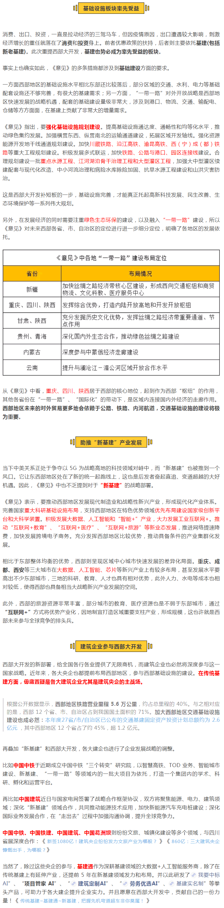 《意見》從推動(dòng)G質(zhì)量發(fā)展、加大西部開放力度、加大美麗西部建設(shè)力度、深化重點(diǎn)L域改革等七個(gè)方面提出了 36 條舉措,涉及政策、基建、產(chǎn)業(yè)和規(guī)劃等,對新時(shí)代推進(jìn)西部大開發(fā)形成新格局作出了部署,因此也被稱為“新的西部大開發(fā)戰(zhàn)略”。