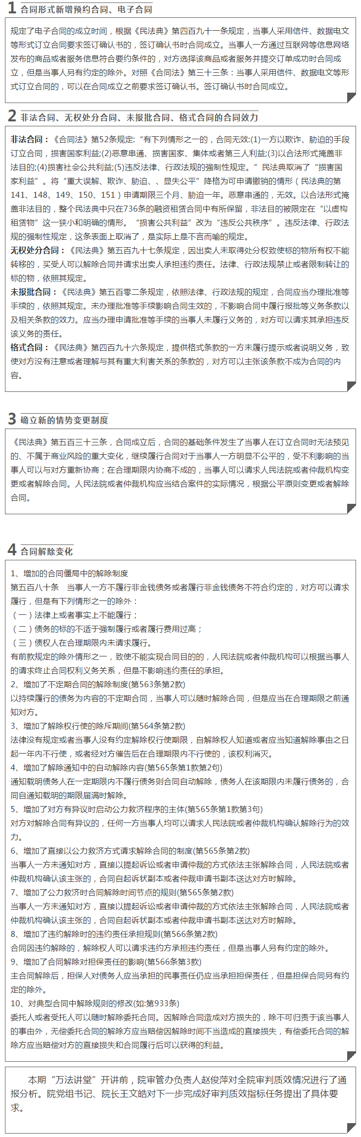 法官助理李洋通過對比民法典《合同編》與現(xiàn)行《中華人民共和國合同法》等新舊法律條文,解讀了《民法典》編纂中對原《合同法》訂立規(guī)則相關法條的完善和創(chuàng)新之處,并歸納總結出九大重大變化,為參會人員理解民法典合同編內(nèi)容提供了理論支撐和觀點參考。