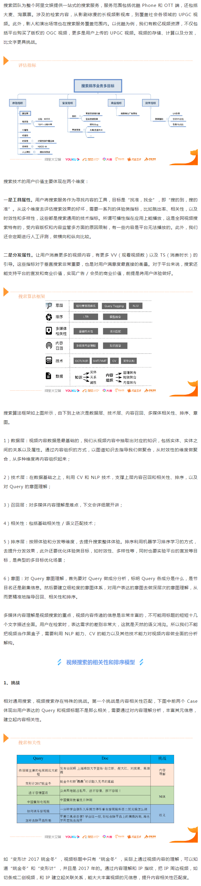 考慮到大家來自不同的業(yè)務(wù)L域和技術(shù)方向,我會(huì)先簡單介紹優(yōu)酷視頻搜索的業(yè)務(wù)背景,同時(shí)快速介紹搜索的基本評(píng)估指標(biāo)、搜索系統(tǒng)的算法框架以及相關(guān)性和排序模型,讓大家對(duì)視頻搜索有一個(gè)更多面的認(rèn)識(shí),后面重點(diǎn)介紹多模態(tài)視頻搜索相關(guān)技術(shù)。