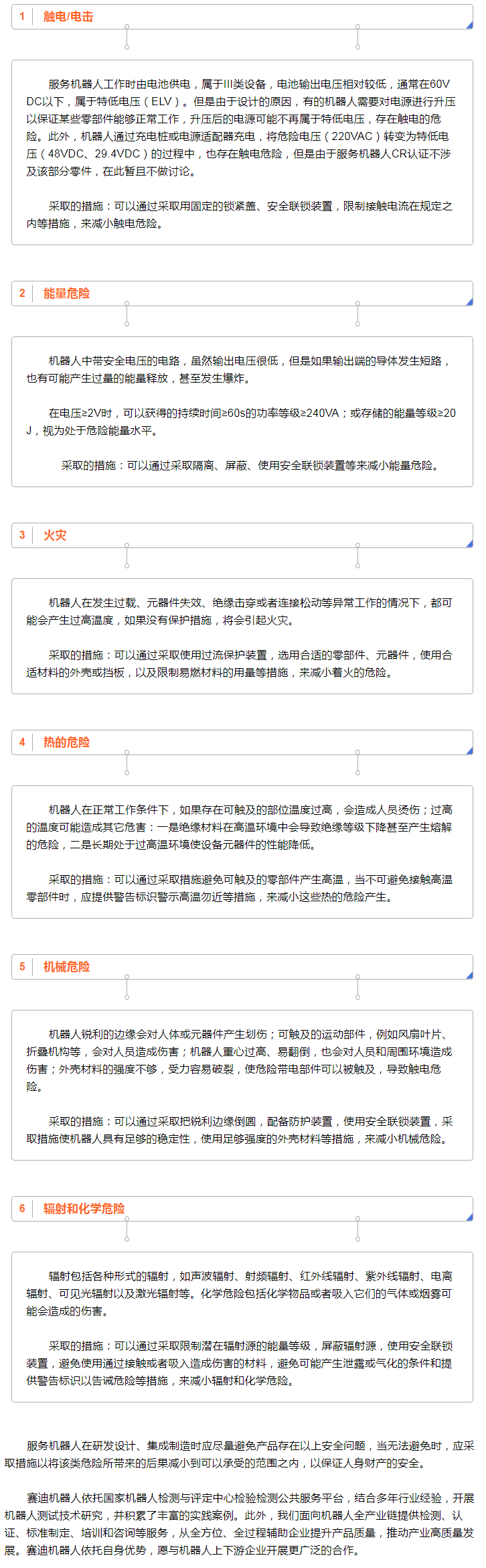 GB 4943.1-2011涵蓋的服務機器人潛在危險有:電擊、與能量有關(guān)的危險、著火、與熱有關(guān)的危險、機械危險、輻射、化學危險等。不同的服務機器人,由于設計和使用場所的不同,各自潛在的主要危險類型不一樣,需要根據(jù)實際情況進行判斷。