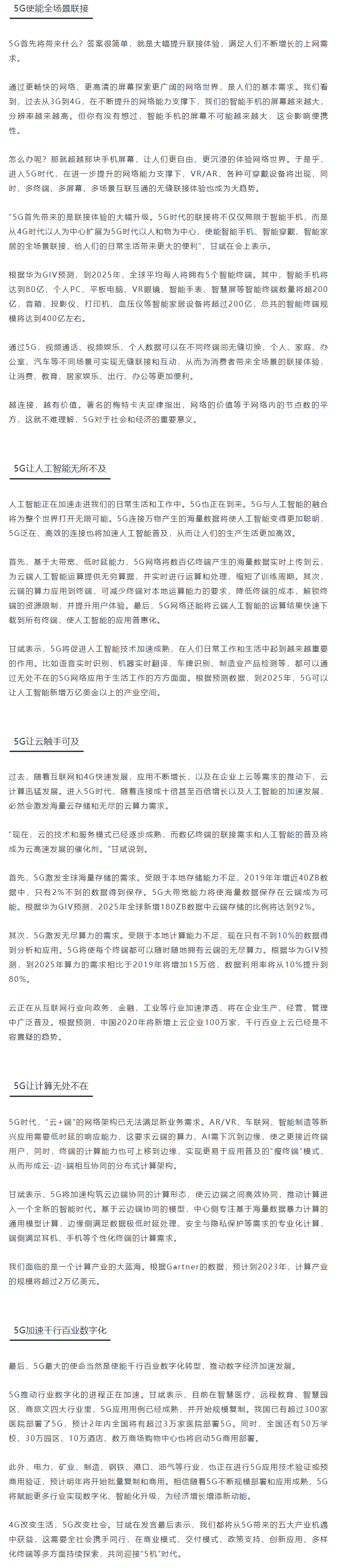 2020年6月30日,在GSMA舉辦的新基建與企業(yè)數(shù)字化論壇上,華為無線網(wǎng)絡(luò)S席營銷官甘斌發(fā)表了《5G=5“機(jī)”,新價值,新機(jī)遇》的主題演講。會上,甘斌詮釋了5G將驅(qū)動聯(lián)接、AI、云、計算、行業(yè)應(yīng)用五大產(chǎn)業(yè)升級,為數(shù)字經(jīng)濟(jì)發(fā)展注入新動能。