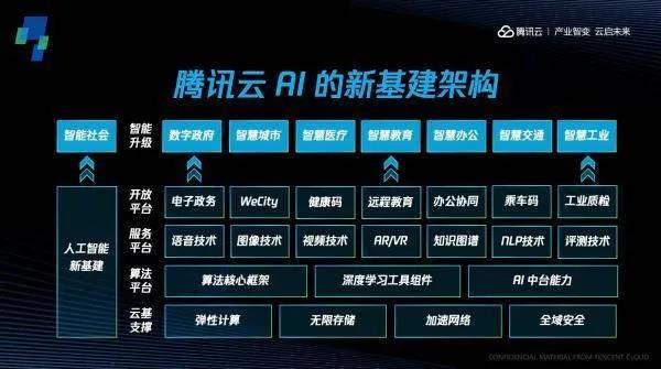 基于騰訊云、企業(yè)微信等社交連接工具,騰訊布局AI新基建全景。騰訊云AI新基建整體布局為“一云三平臺”架構(gòu)。一云是騰訊云,三平臺包括算法平臺、服務(wù)平臺以及開放平臺。