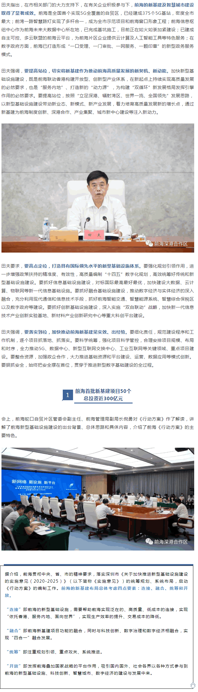 8月6日,前海蛇口自貿(mào)片區(qū)管委會(huì)舉行“《加快新型基礎(chǔ)設(shè)施建設(shè)推動(dòng)前海數(shù)字經(jīng)濟(jì)G質(zhì)量發(fā)展的行動(dòng)方案(2020-2025年)》發(fā)布暨專(zhuān)項(xiàng)行動(dòng)工作會(huì)議”,正式發(fā)布實(shí)施《加快新型基礎(chǔ)設(shè)施建設(shè)推動(dòng)前海數(shù)字經(jīng)濟(jì)G質(zhì)量發(fā)展的行動(dòng)方案(2020—2025年)》(下稱(chēng)《行動(dòng)方案》)。這是深圳市《關(guān)于加快推進(jìn)新型基礎(chǔ)設(shè)施建設(shè)的實(shí)施意見(jiàn)(2020-2025)》出臺(tái)之后,全市加快推進(jìn)新基建的行動(dòng)方案,計(jì)劃實(shí)施32項(xiàng)新型基礎(chǔ)設(shè)施行動(dòng),包括信息基礎(chǔ)設(shè)施建設(shè)9項(xiàng)行動(dòng)、融合基礎(chǔ)設(shè)施建設(shè)12項(xiàng)行動(dòng)、創(chuàng)新基礎(chǔ)設(shè)施建設(shè)11項(xiàng)行動(dòng),首批重點(diǎn)項(xiàng)目50個(gè)、總投資近300億元。