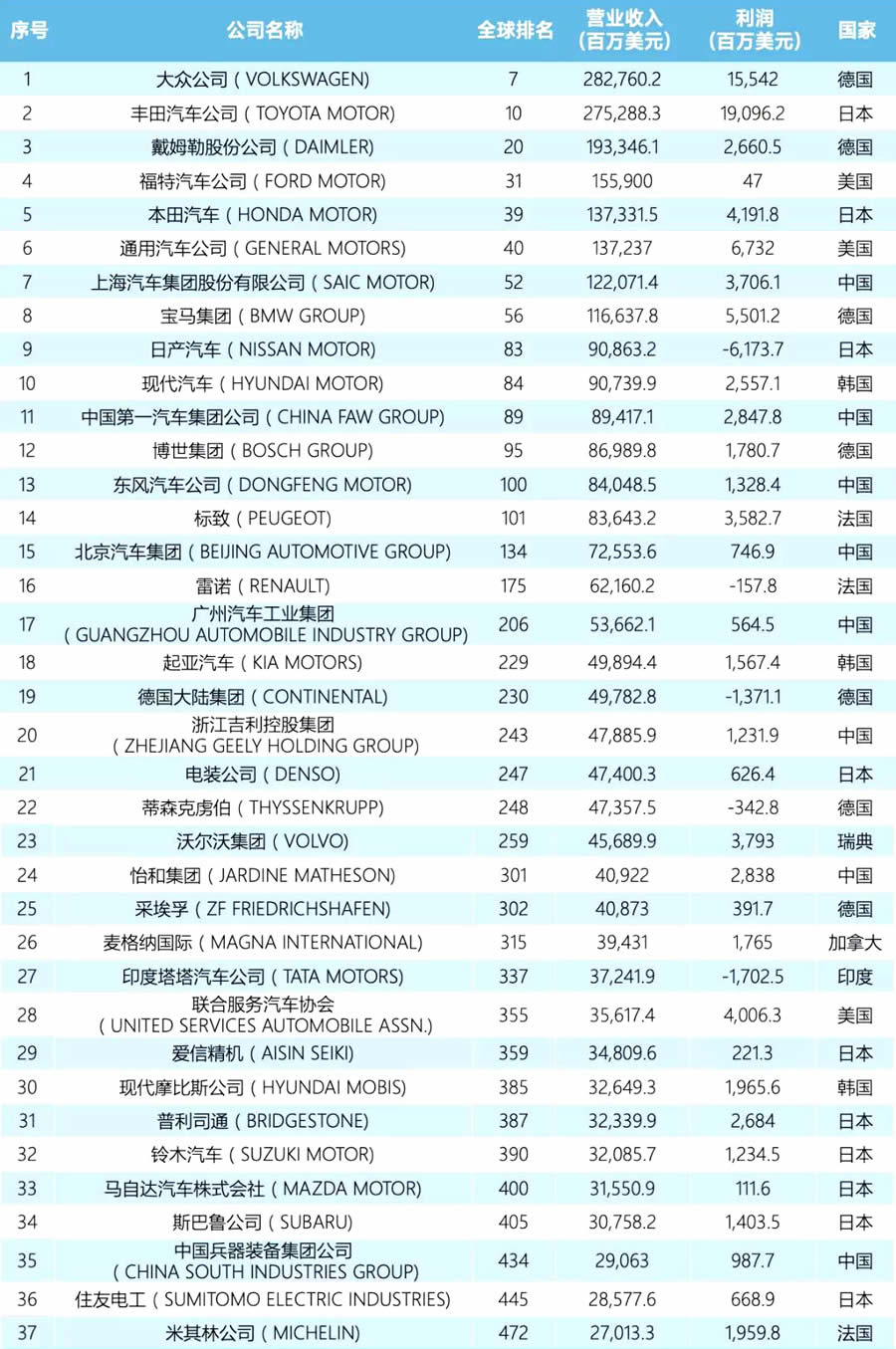 2020年,共有37家汽車企業(yè)入圍《財(cái)富》榜單,占總數(shù)的7.4%。