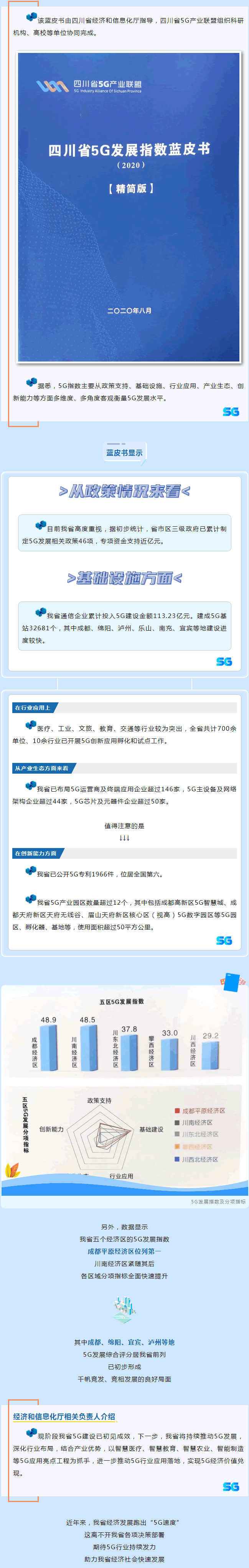 四川省5G產(chǎn)業(yè)聯(lián)盟牽頭編制的《四川省5G發(fā)展指數(shù)藍(lán)皮書(2020版)》(下簡稱:5G發(fā)展指數(shù))首次發(fā)布。此次發(fā)布的藍(lán)皮書由省經(jīng)濟(jì)和信息化廳指導(dǎo),四川省5G產(chǎn)業(yè)聯(lián)盟組織科研機(jī)構(gòu)、G校等單位協(xié)同完成。該藍(lán)皮書顯示,四川5G建設(shè)已初見成效:通信企業(yè)累計投入5G建設(shè)金額113.23億元;在創(chuàng)新能力方面,已公開5G專利1966件,位居全國第六,5G產(chǎn)業(yè)園區(qū)數(shù)量超過12個;在產(chǎn)業(yè)生態(tài)方面,已布局5G運(yùn)營商及終端應(yīng)用企業(yè)超146家,5G主設(shè)備及網(wǎng)絡(luò)架構(gòu)企業(yè)超44家,5G芯片及元器件企業(yè)超50家。