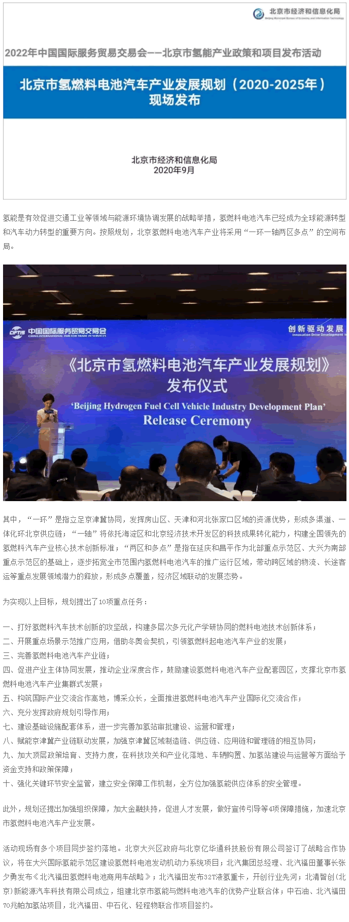 9月8日,北京市經(jīng)濟(jì)和信息化局正式發(fā)布《北京市氫燃料電池汽車產(chǎn)業(yè)發(fā)展規(guī)劃(2020-2025年)》(以下簡(jiǎn)稱“規(guī)劃”)。規(guī)劃分兩個(gè)階段提出發(fā)展目標(biāo):2023年前,培育3-5家具有國(guó)際影響力的氫燃料電池汽車產(chǎn)業(yè)鏈龍頭企業(yè),力爭(zhēng)推廣氫燃料電池汽車3000輛,氫燃料電池汽車全產(chǎn)業(yè)鏈累計(jì)產(chǎn)值突破85億元;2025年前,培育5-10家具有國(guó)際影響力的氫燃料電池汽車產(chǎn)業(yè)鏈龍頭企業(yè),力爭(zhēng)實(shí)現(xiàn)氫燃料電池汽車?yán)塾?jì)推廣量突破1萬(wàn)輛,氫燃料電池汽車全產(chǎn)業(yè)鏈累計(jì)產(chǎn)值突破240億元。