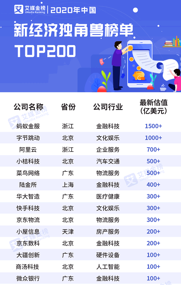 近日,數(shù)據(jù)挖掘和分析機構(gòu)iiMedia Research(艾媒咨詢)權(quán)威發(fā)布《2020中國新經(jīng)濟(jì)獨角獸200強榜單》。本排行榜中企業(yè)評選對象為估值超過10億美元的未上市企業(yè),相關(guān)信息統(tǒng)計截至2020年7月10日。