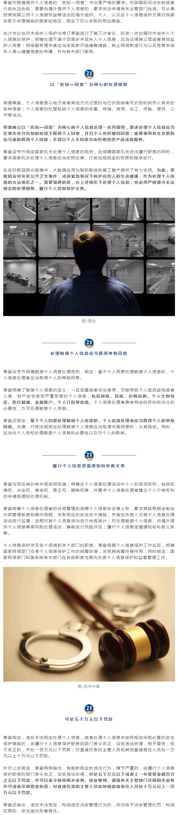 據(jù)介紹,草案共八章70條,明確了適用范圍,健全了個人信息處理規(guī)則,完善了個人信息跨境提供規(guī)則,明確個人信息處理活動中個人的權(quán)利和處理者義務(wù),并明確履行個人信息保護職責的部門。