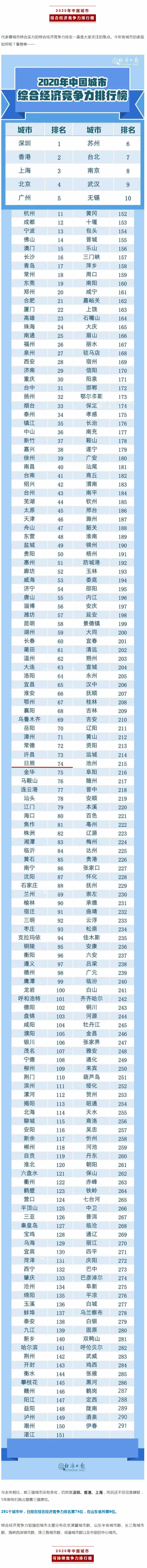 報(bào)告顯示,2020年城市綜合經(jīng)濟(jì)競(jìng)爭(zhēng)力指數(shù)10強(qiáng)依次是:深圳、香港、上海、北京、廣州、蘇州、臺(tái)北、南京、武漢和無(wú)錫。2020年中國(guó)可持續(xù)競(jìng)爭(zhēng)力指數(shù)10強(qiáng)依次是:香港、深圳、臺(tái)北、上海、北京、廣州、蘇州、南京、青島和武漢。