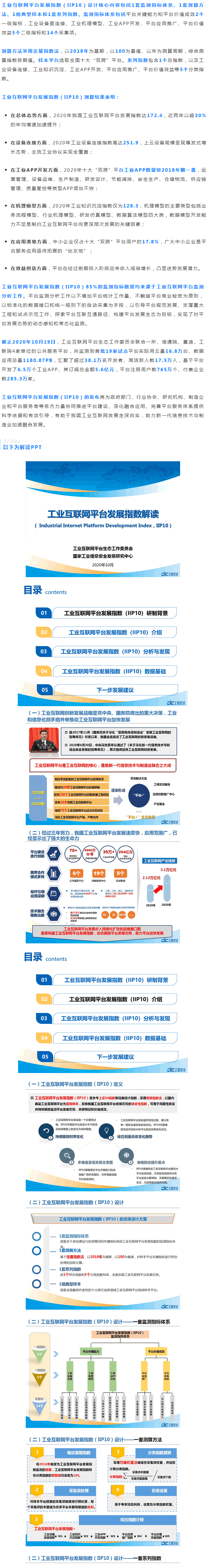 在2020年10月21日的兩化融合暨工業(yè)互聯網平臺大會的開幕式上,工業(yè)互聯網平臺發(fā)展指數(IIP10)正式發(fā)布。該指數是受工業(yè)和信息化部信息技術發(fā)展司委托研究,由工業(yè)互聯網平臺生態(tài)工作委員會和國家工業(yè)信息安全發(fā)展研究中心聯合研制。