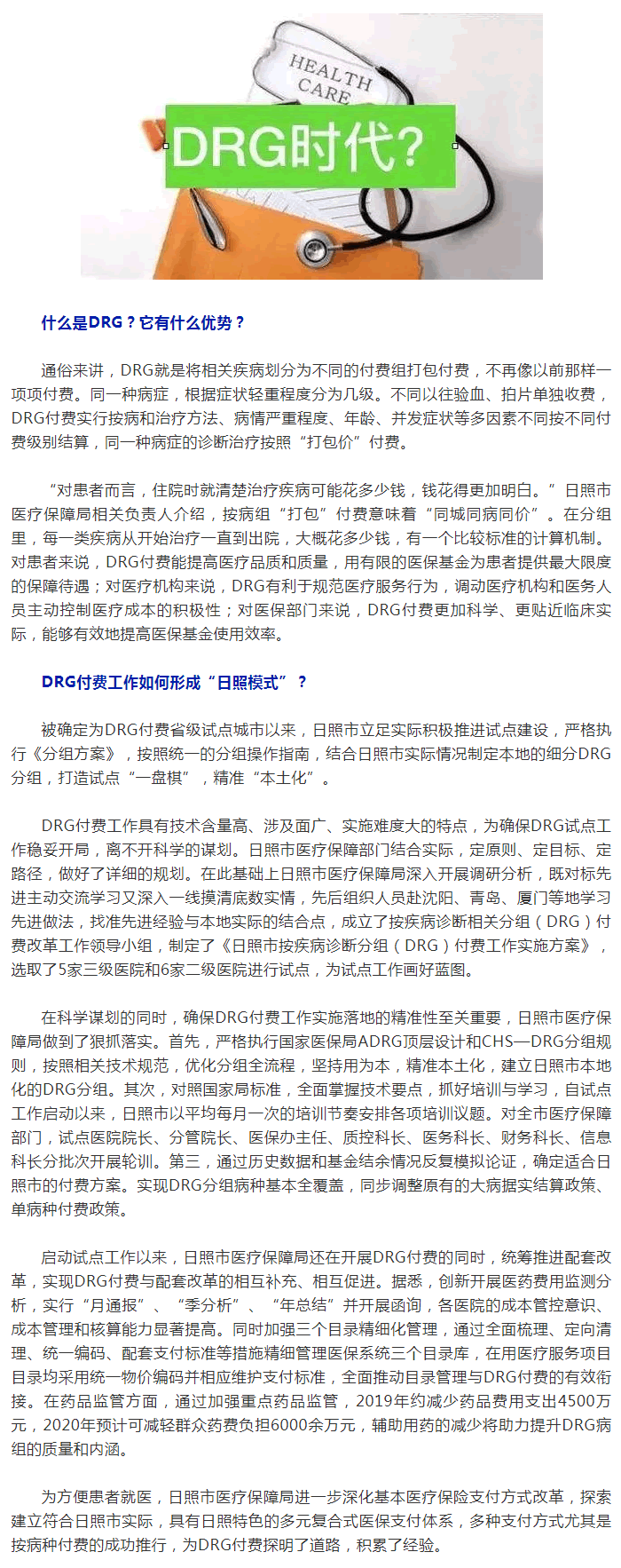 一直以來,傳統(tǒng)的“按項目付費”方式被認為是導(dǎo)致過度醫(yī)療、大處方的重要原因之一,在浪費醫(yī)療資源的同時也加重了老百姓就醫(yī)負擔(dān),呼吁改革的聲音不斷。為健全醫(yī)保支付機制,激發(fā)醫(yī)療機構(gòu)規(guī)范行為、控制成本的內(nèi)生動力,去年5月,國家醫(yī)保局啟動按疾病診斷相關(guān)分組(DRG)付費試點,山東省在組織青島市參加國家試點的同時,首批選取10個市開展DRG付費省級試點,日照市位列其中。
