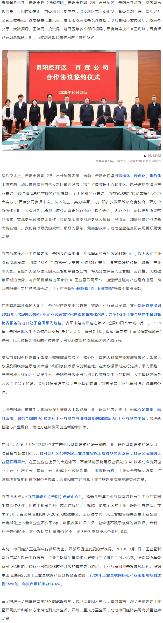 10月23日,百度與貴州省貴陽市政府正式簽署戰(zhàn)略合作協(xié)議,與貴陽經(jīng)開區(qū)舉行工業(yè)互聯(lián)網(wǎng)項(xiàng)目簽約儀式。百度將承接貴陽經(jīng)開區(qū)工業(yè)互聯(lián)網(wǎng)項(xiàng)目建設(shè),打造 AI 技術(shù)和工業(yè)互聯(lián)網(wǎng)應(yīng)用相融合的 AI 工業(yè)互聯(lián)網(wǎng)平臺,形成多面的工業(yè)互聯(lián)網(wǎng)生態(tài)體系,助力貴陽打造3個(gè)千億級產(chǎn)業(yè)集群,形成新的經(jīng)濟(jì)增長點(diǎn)。