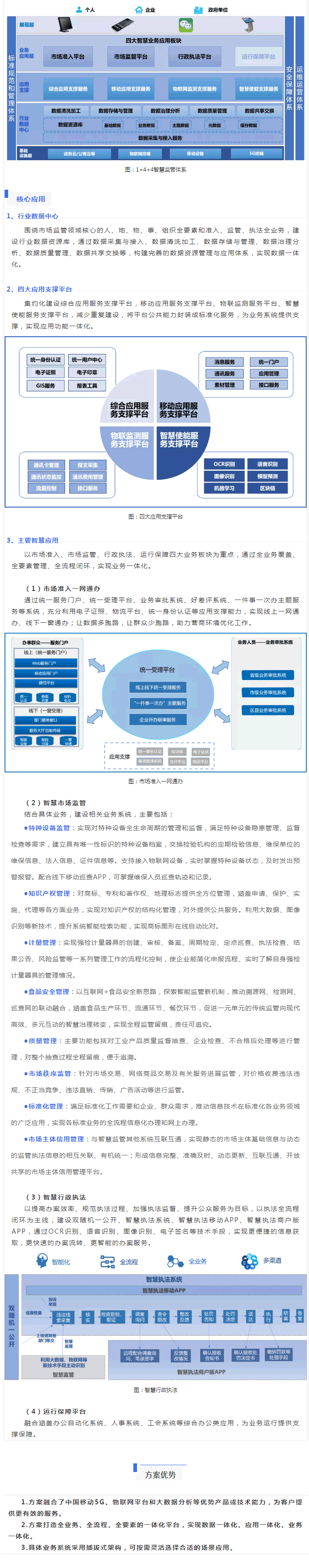 系統(tǒng)以市場準(zhǔn)入一網(wǎng)通辦,加強市場監(jiān)管智慧水平,提升行政執(zhí)法效能為核心訴求,充分利用5G、物聯(lián)網(wǎng)、移動互聯(lián)網(wǎng)、大數(shù)據(jù)等技術(shù)手段,打造智慧監(jiān)管一體化平臺,助力市場準(zhǔn)入、監(jiān)管、執(zhí)法業(yè)務(wù)改革與發(fā)展。