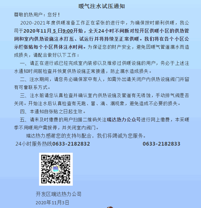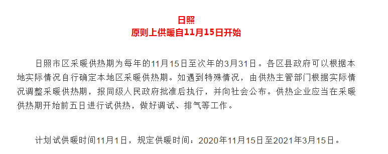 日照主城區(qū)試供熱,11月15日起達(dá)標(biāo)供熱,供熱時間為11月15日至次年的3月31日,
