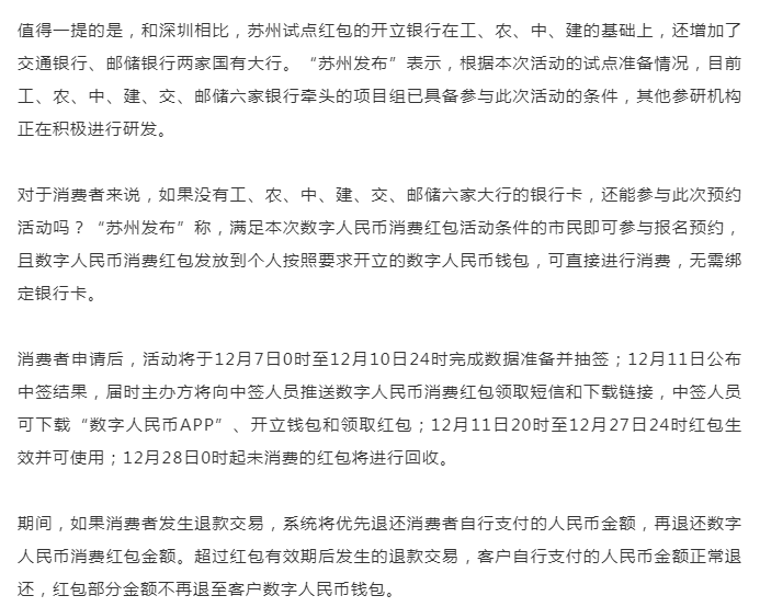 根據(jù)“蘇州發(fā)布”,此次“雙12蘇州購物節(jié)”數(shù)字人民幣消費紅包將采取“搖號抽簽”形式發(fā)放,非先到先得,無需爭搶。抽簽報名通道自2020年12月5日0時正式開啟,持續(xù)至12月6日24時。