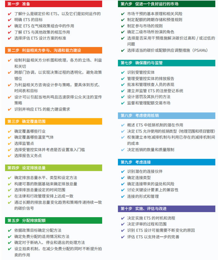 這些步驟之間相互依存,每一步所作的選擇都將對其他步驟的決策產(chǎn)生重要影響。在實(shí)踐中,ETS 的設(shè)計(jì)過程是“迭代”而 非“線性”的。2016 年初版手冊發(fā)布之后,隨著 ETS 在各個(gè) 國家和地區(qū)的發(fā)展,很多新見解、新方法和新設(shè)計(jì)思路都影響著 ETS 的運(yùn)行方式,也進(jìn)一步加深了我們對于 ETS 的理解和認(rèn)識。所有這些新內(nèi)容我們都在本手冊的相關(guān)章節(jié)中予以更新。
