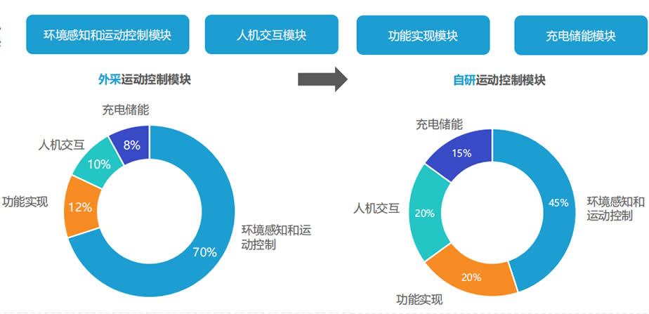 其中,人機(jī)交互模塊、功能實(shí)現(xiàn)模塊和充電儲能模塊基本實(shí)現(xiàn)自研。以往,環(huán)境感知和運(yùn)動控制模塊會有部分企業(yè)選擇外采,但隨著技術(shù)的進(jìn)步以及成本考慮,現(xiàn)在多數(shù)機(jī)器人企業(yè)也實(shí)現(xiàn)了環(huán)境感知和運(yùn)動控制模塊的自研。