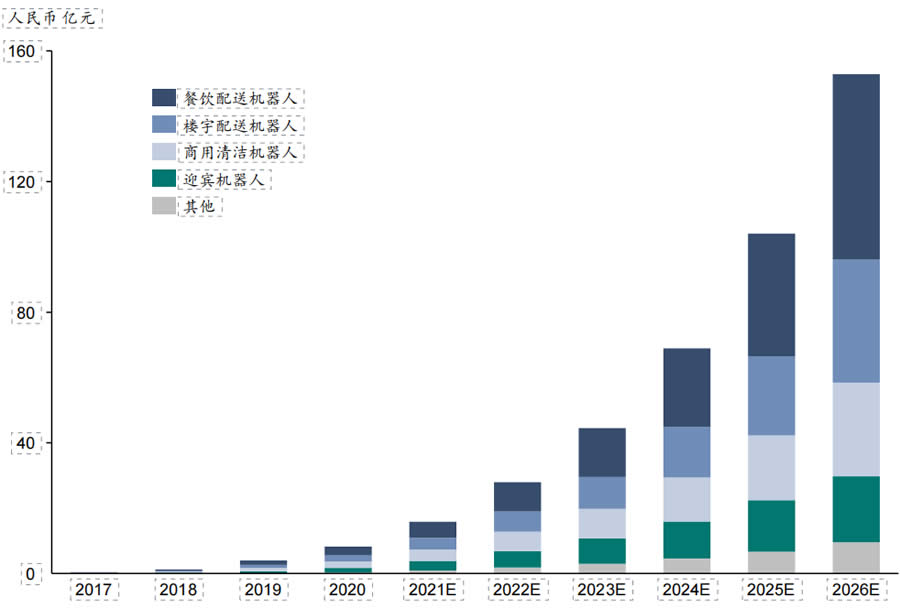 推進(jìn),中國商用服務(wù)機(jī)器人行業(yè)將迎來快速增長,預(yù)計(jì)2026年市場將超過150億元人民幣,其中餐飲配送機(jī)器人、商用清潔機(jī)器人、樓宇配送機(jī)器人為前三大