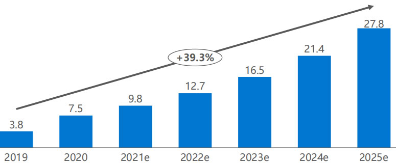 受新G疫情的防疫需求帶動,加之清潔行業(yè)長期面臨招工難、人力成本G等 痛點,商用清潔機器人的市場需求愈發(fā)旺盛。特別是具備智能消毒功能的清 潔機器人,通過集成消毒液自動噴灑系統(tǒng),實現(xiàn)全域噴霧消殺,可以有效降 低人力工作強度和交叉感染風(fēng)險,已在地鐵站、機場、辦公區(qū)、展館、酒店 等場景加速落地應(yīng)用。在需求驅(qū)動下,商用清潔機器人的市場規(guī)模快速增長。 2019年中國商用清潔機器人的市場規(guī)模約3.8億元,預(yù)計2021年將達(dá)到9.8 億元,2025年將達(dá)到27.8億元,年復(fù)合增長率約39.3%*。