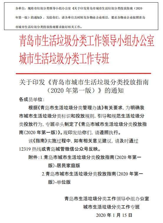 根據(jù)《青島市生活垃圾分類管理辦法》有關(guān)要求,為明確我市城市生活垃圾分類標(biāo)識和投放規(guī)則,引導(dǎo)和規(guī)范生活垃圾分類投放行為,專班牽頭制定了《青島市城市生活垃圾分類投放指南(2020 年D一版)》,F(xiàn)印發(fā)給你們,請遵照執(zhí)行。